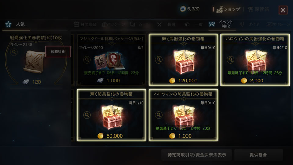 イベント装備アイテムの強化には通常の装備強化の巻物だけでなく、「ショップ」にてアデナで購入可能なイベント専用の装備強化の巻物を使用することができます。