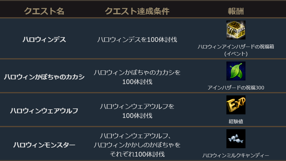 ハロウィン専用ダンジョン「悪霊が住まう地」に関連したクエストを達成すると、アインハザードの祝福を追加することができる「ハロウィンアインハザードの祝福箱(イベント)」など、さまざまなアイテムを獲得することができます。