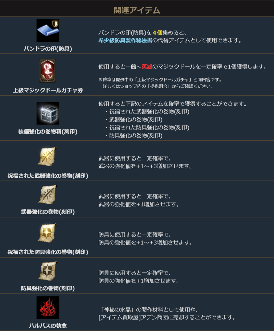 各パンドラの補給パッケージの購入で1つずつ獲得できる「パンドラの印(防具)」を4つ集めると、希少級防具製作秘法書の代替アイテムとして使用することができます。