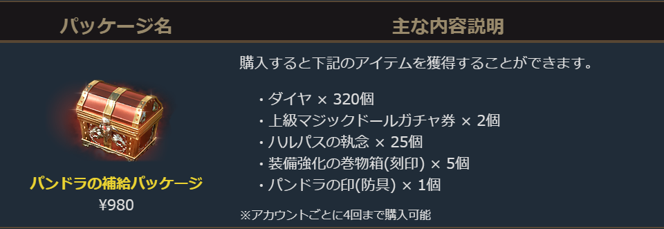 商品を4回購入すると、希少級防具製作秘法書の代替アイテムが手に入る「パンドラの補給パッケージ」についてお知らせいたします。