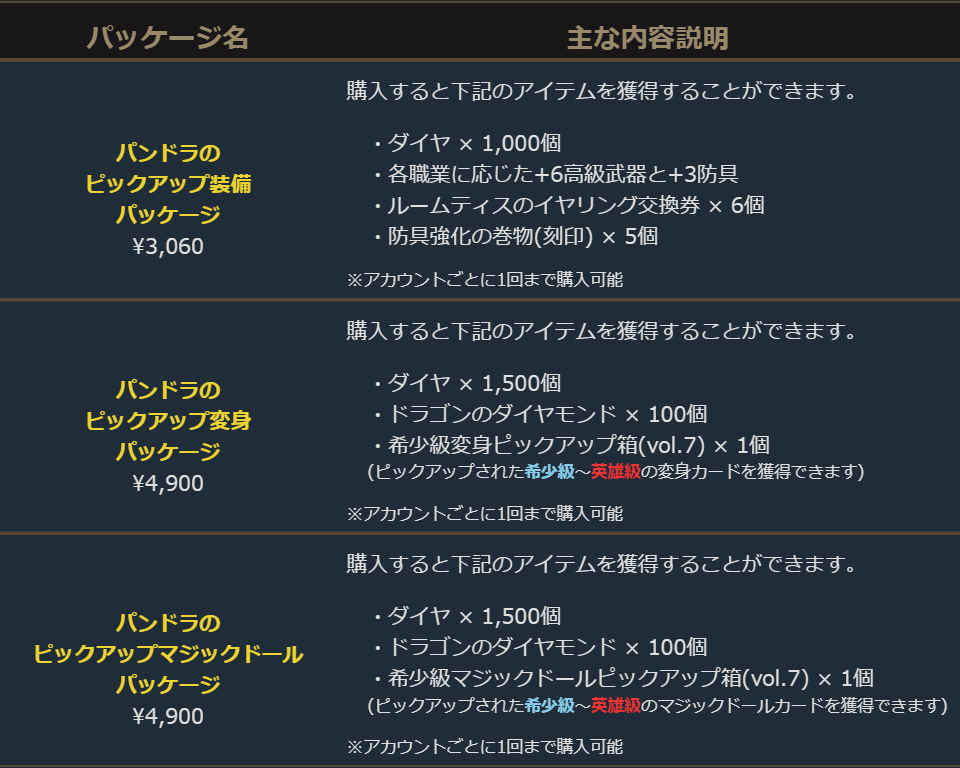 パンドラがピックアップした装備や変身などをお得に獲得できる「パンドラのピックアップパッケージ」についてお知らせいたします。