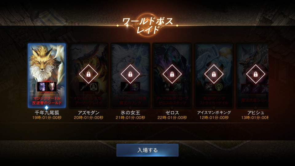 2. 入場可能なワールドボスレイドを選択し「入場する」ボタンを選択します。