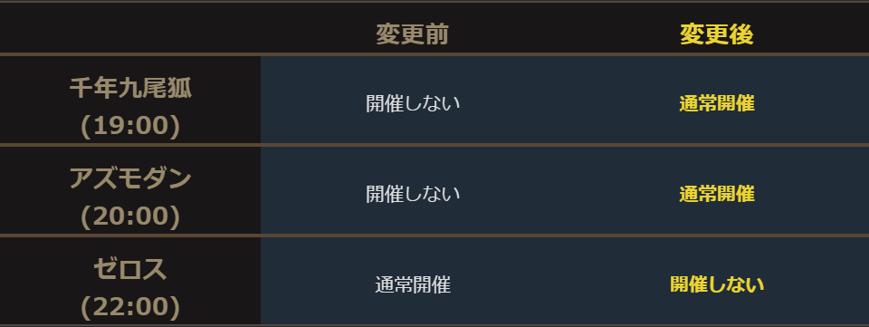 攻城戦の開始時間変更に伴い、攻城戦開催日におけるワールドボスの出現について下記の通り変更いたします。