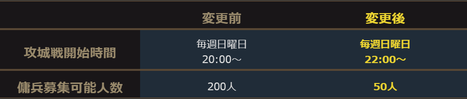ユーザーアンケートやファンミーティング等でいただいたご意見をもとに、攻城戦の開始時間と傭兵の募集可能人数に関しまして、下記の通り仕様を変更させていただきます。