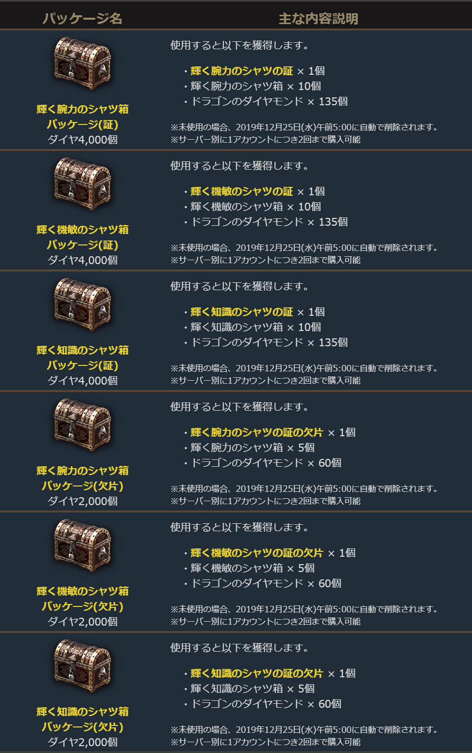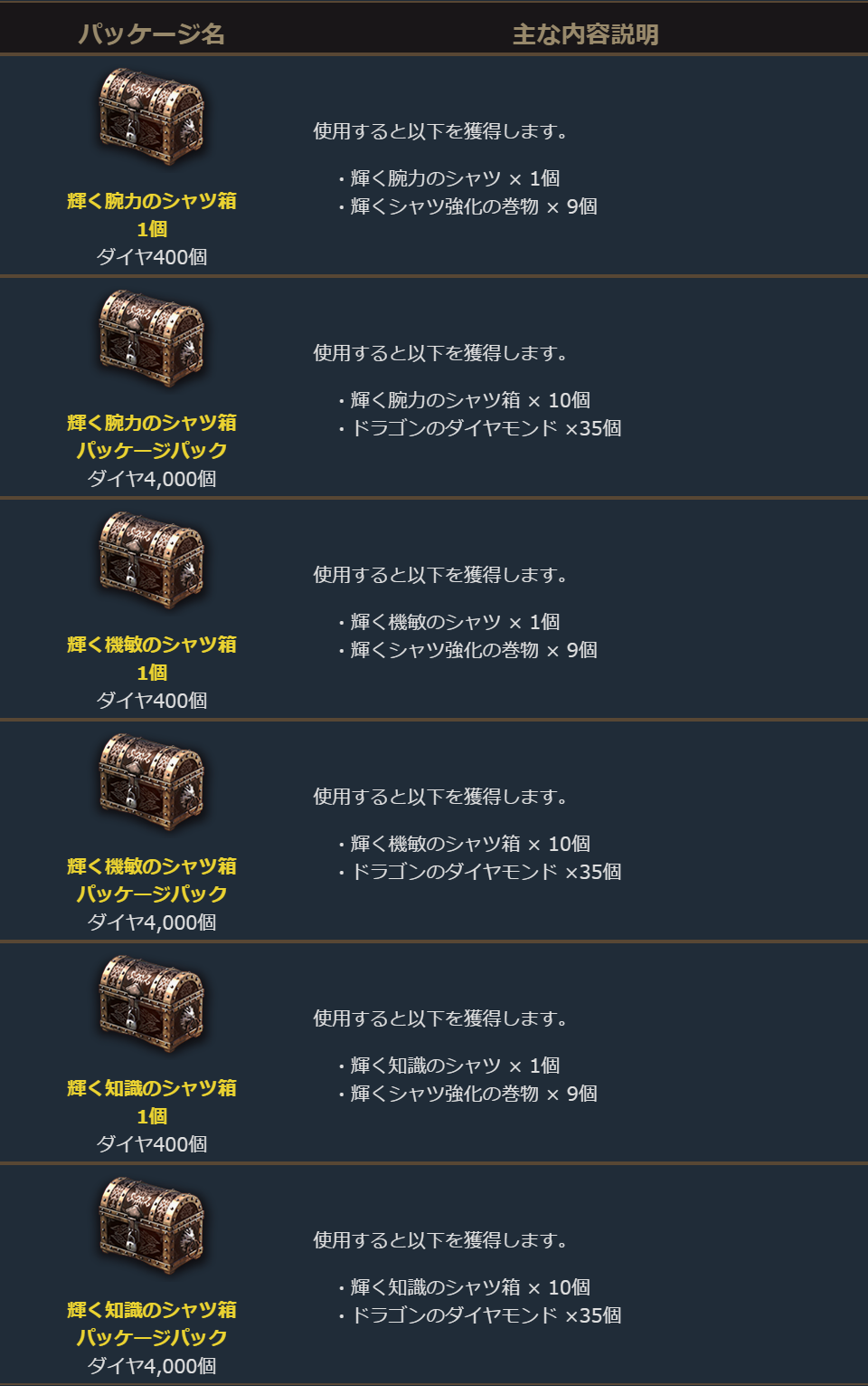 「輝くシャツ」の販売を記念して、特別な製作の材料となるアイテムや通常販売パッケージよりも多くのドラゴンのダイヤモンドが手に入る記念パッケージが登場!
