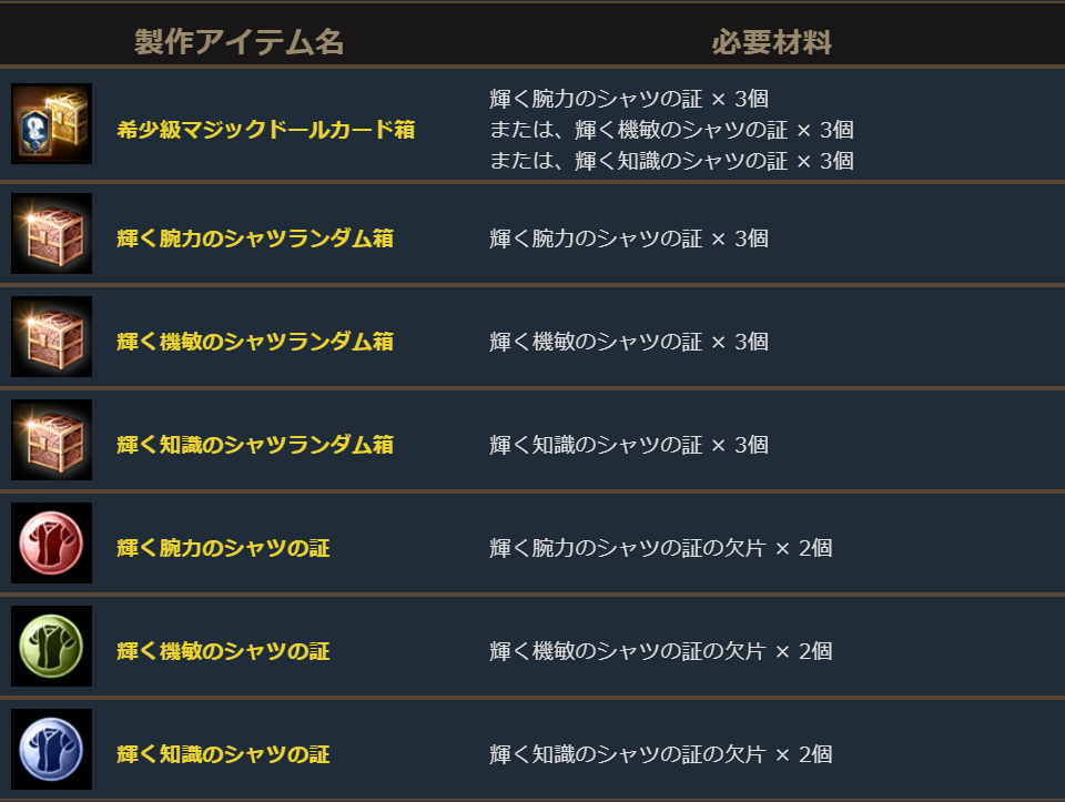 なお、各シャツ箱を材料に製作を行った場合は「輝くシャツ強化の巻物」は獲得できませんので製作する個数に注意してご利用ください。