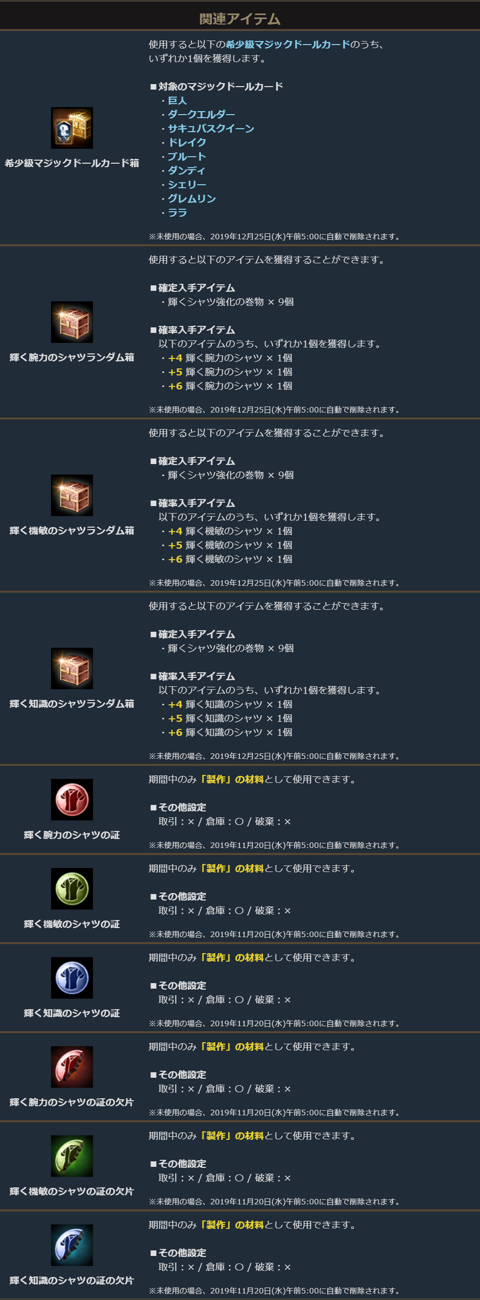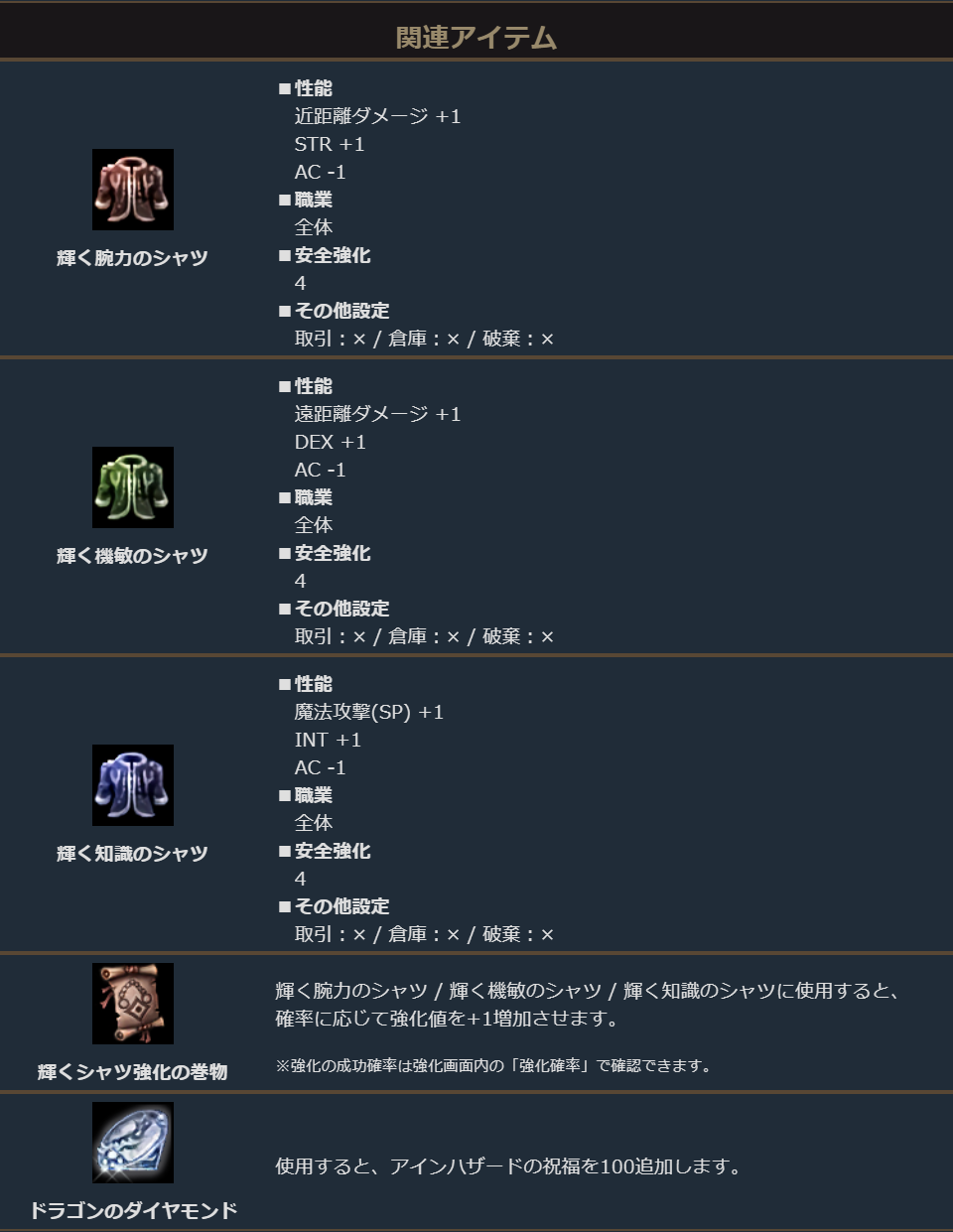 ※「輝く腕力のシャツ」「輝く機敏のシャツ」「輝く知識のシャツ」は付属する「輝くシャツ強化の巻物」を使用して強化することができます。