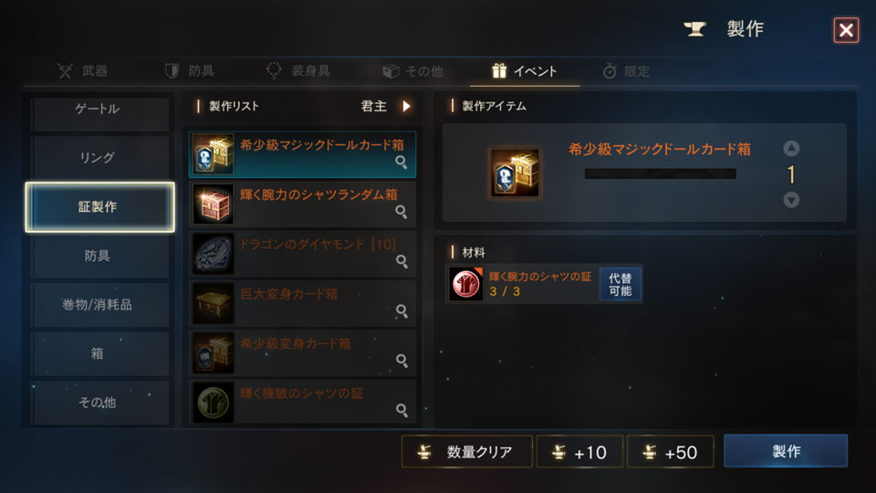 記念パッケージを通じて獲得できる「シャツの証」を使用して、ゲーム内の「製作」>「イベント」タブで特別な製作に挑戦することができます。