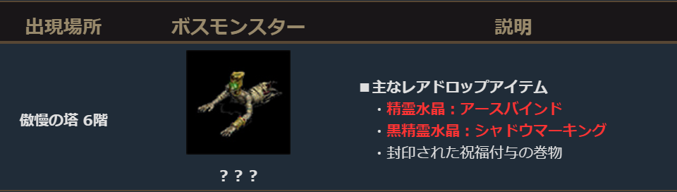 傲慢の塔6階に出現するボスは非常に強力ですが、エルフ専用の英雄級スキルブック「精霊水晶:アースバインド」や、ダークエルフ専用の英雄級スキルブック「黒精霊水晶:シャドウマーキング」など、貴重なアイテムを獲得できる可能性があります。