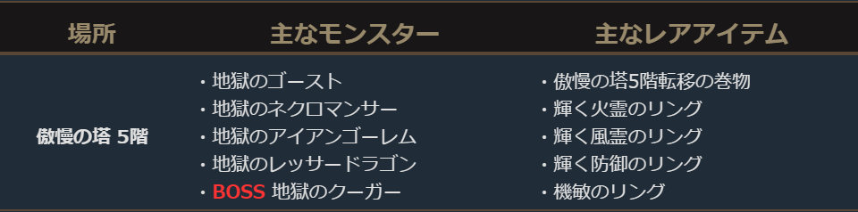傲慢の塔5階は、地獄のアイアンゴーレムなど武器を破損させる特性を持つモンスターが多数棲息している階層です。