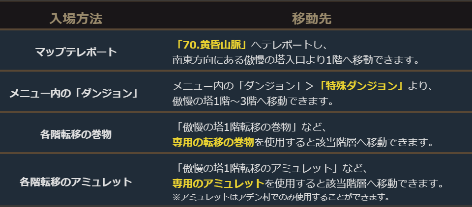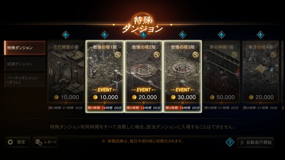 サポート期間中、メニュー内の「ダンジョン」を通じて各階転移の巻物を使用せずに傲慢の塔1階~3階に挑戦することができます。