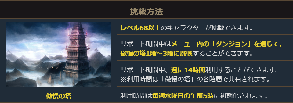 サポート期間中、「傲慢の塔」の利用時間が週14時間に延長されます。