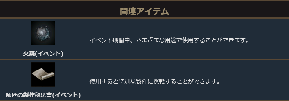 製作には、 師匠の製作秘法書(イベント)×1個と火薬(イベント)×15個が必要となります。