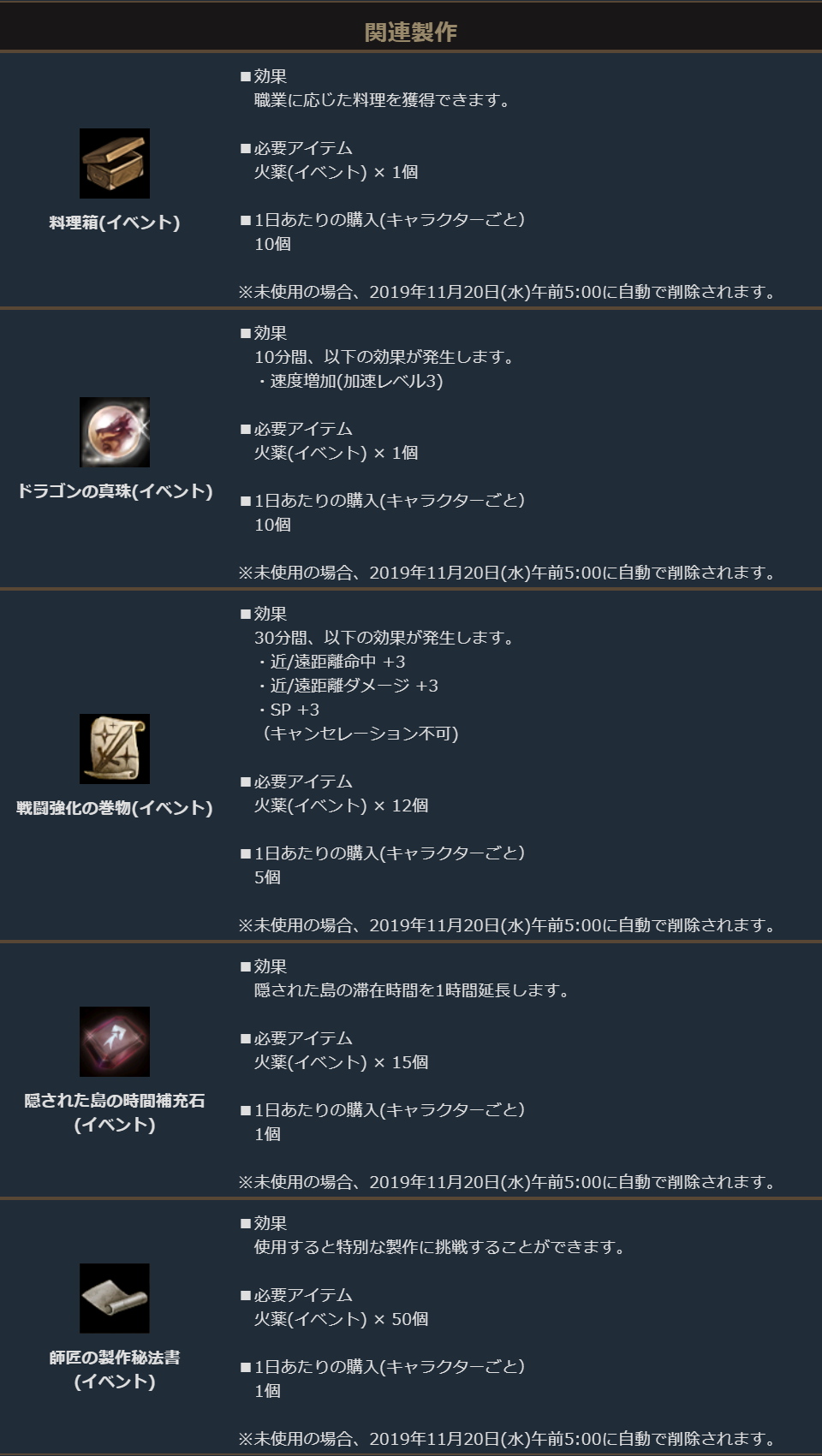 「隠された島」に棲息するモンスターからは、イベント商人の利用時に必要となる「火薬(イベント)」や、特別な製作に挑戦することができる「師匠の製作秘法書(イベント)」を獲得できる可能性があります。