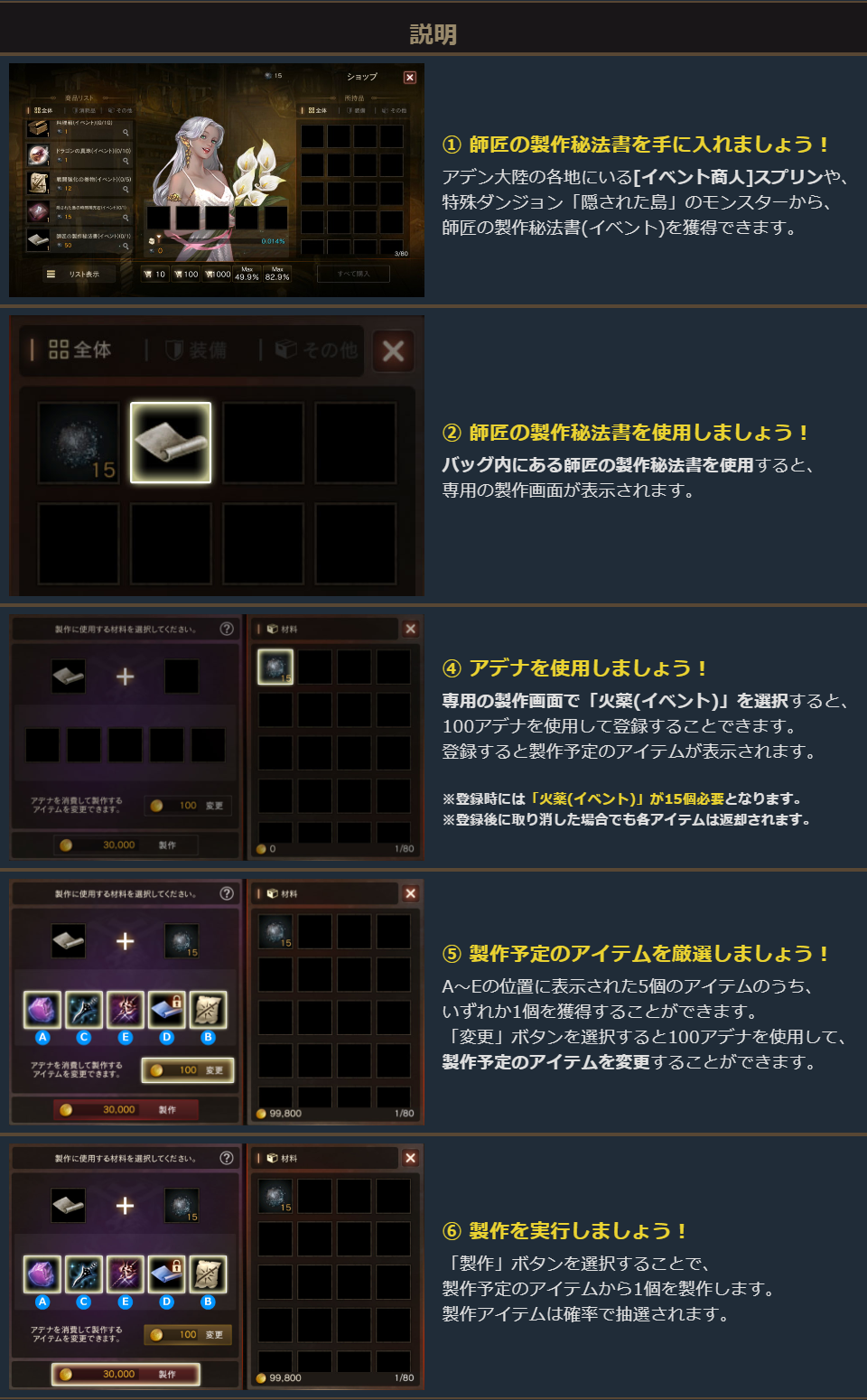 イベントで獲得できる「師匠の製作秘法書(イベント)」を使用すると、製作画面内に表示されたアイテムを一定確率で獲得できる特別な製作に挑戦することができます。