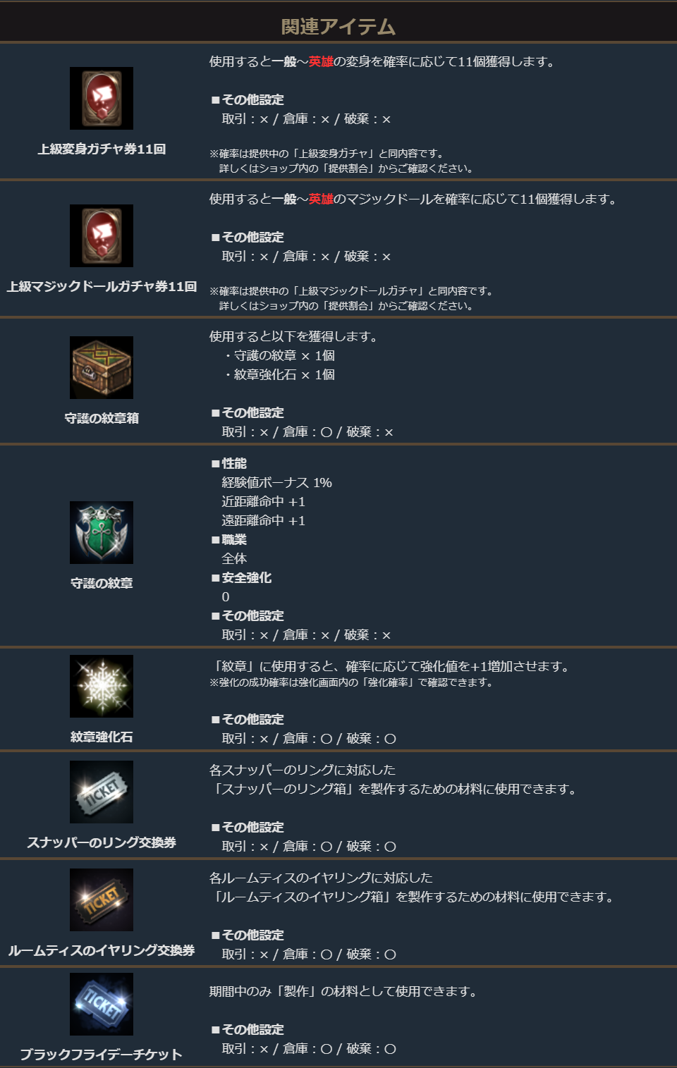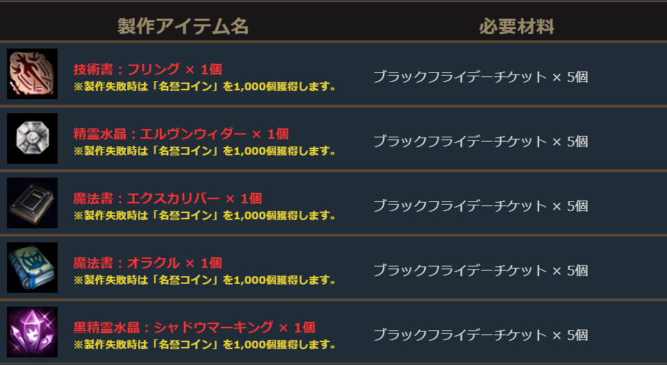「ブラックフライデーチケット」を使用したサーバー数量限定の製作アイテムは一定確率で製作することができ、製作に失敗した場合でも「名誉コイン1,000個」を獲得することができます。