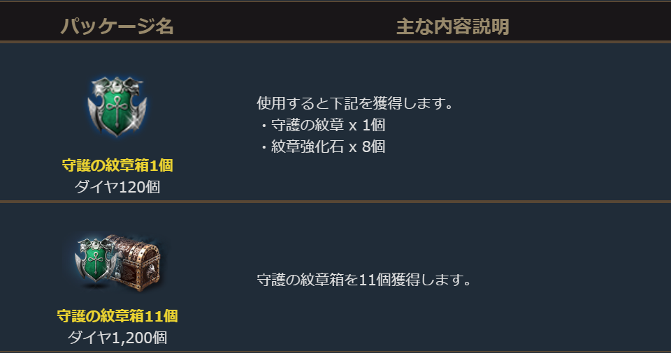 「守護の紋章」の販売を記念して、一定数集めると、さまざまなアイテムと交換することができる紋章チケットが手に入る記念パッケージが登場!