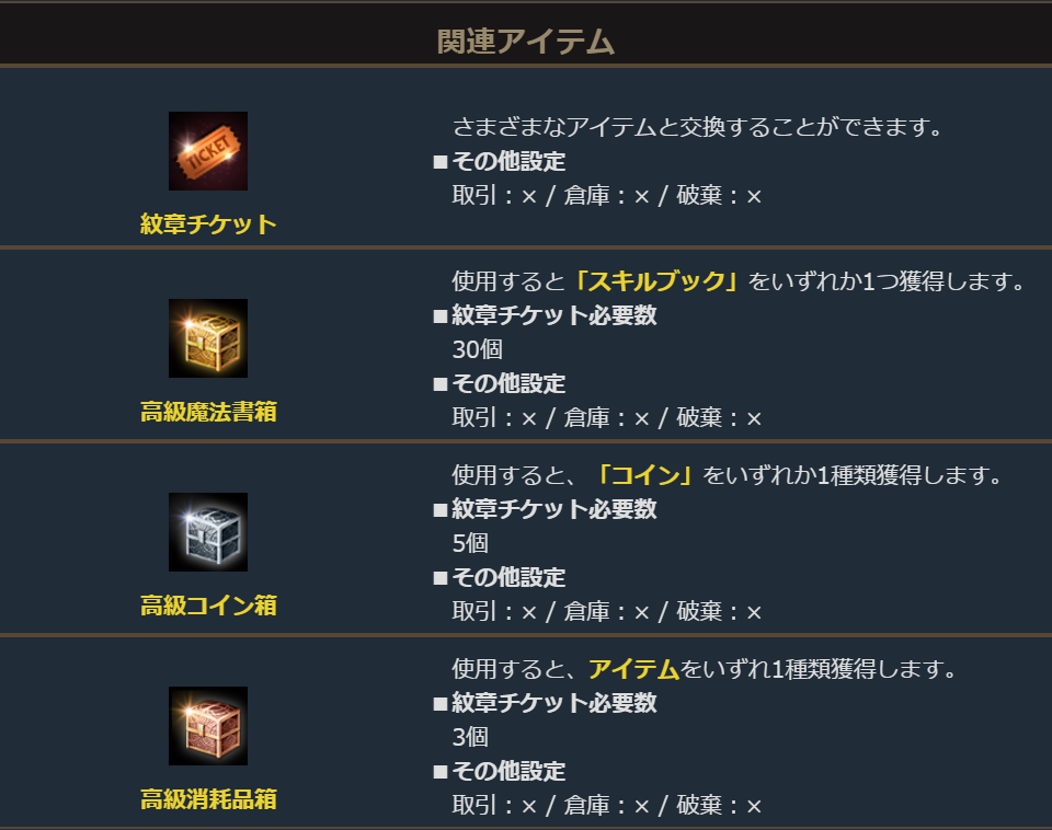 「紋章チケット」を複数個集めると、「製作」を通して、さまざまなアイテムと交換することができます。