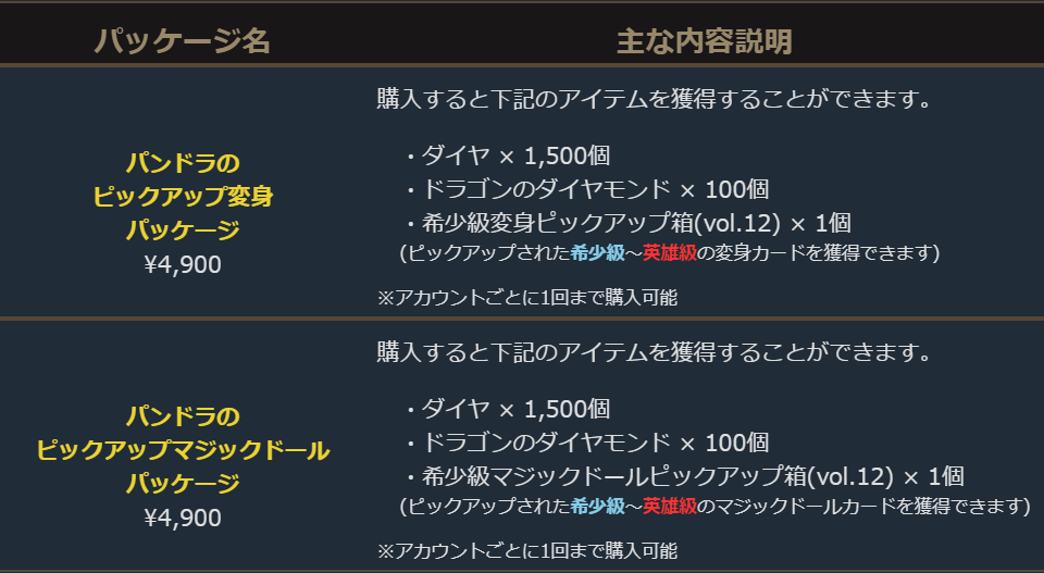 「パンドラのピックアップ変身パッケージ」と「パンドラのピックアップマジックドールパッケージ」の販売を開始しました。