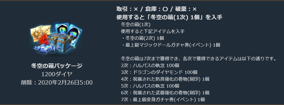 ※各「冬空の箱」「最上級ガチャ券(イベント)」には2020年2月26日5:00までの削除期限が設けられています。