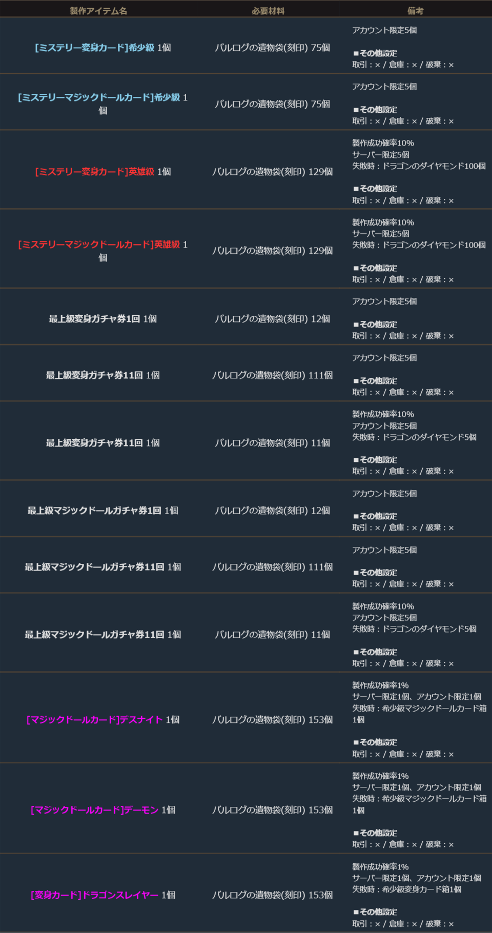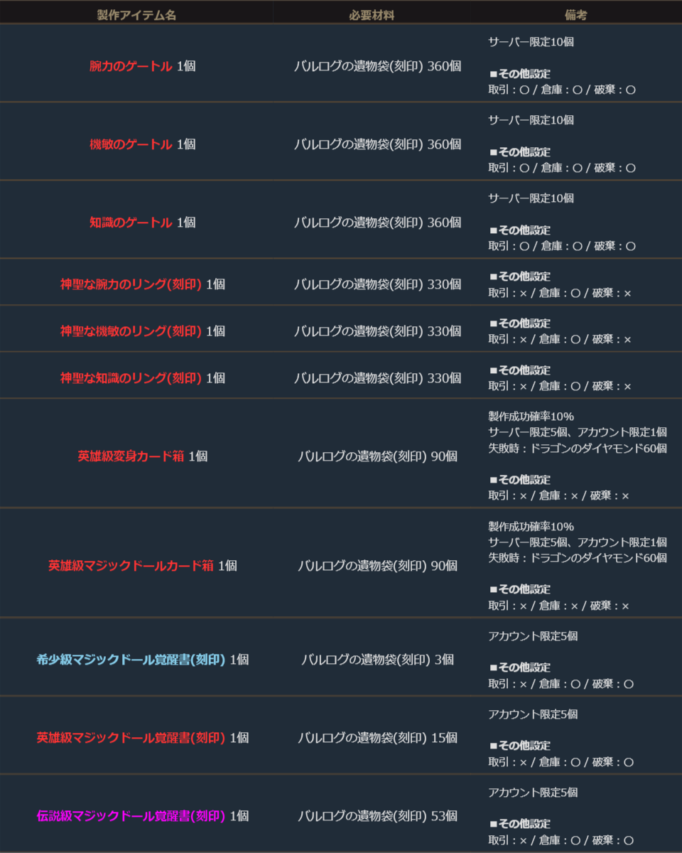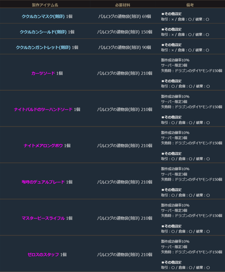「オリムの日記帳」や「パンドラの製作秘法書」を使用した製作とは異なり、「バルログの製作秘法書」と「アデナ」を利用して製作することが可能です。