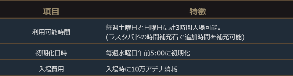 ラスタバドは、レベル70以上のキャラクターで毎週土曜日と日曜日に計3時間入場可能です。