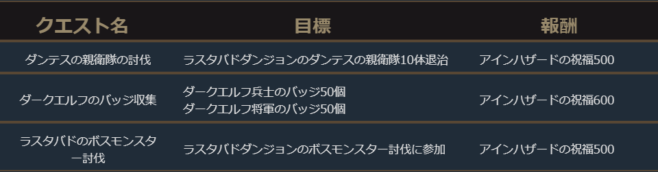 ・ラスタバド地域でのみ遂行可能な特別クエストを3つ追加します。(毎週水曜日午前5:00に進行回数初期化)