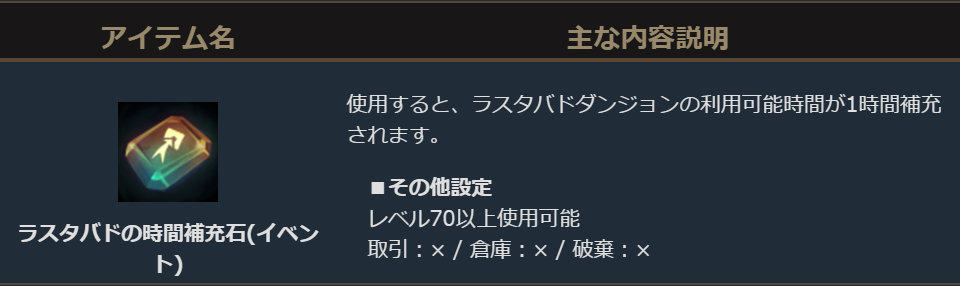 ※ラスタバドの時間補充石(イベント)は、2020年2月5日(水)定期メンテナンス時に全て削除いたします。