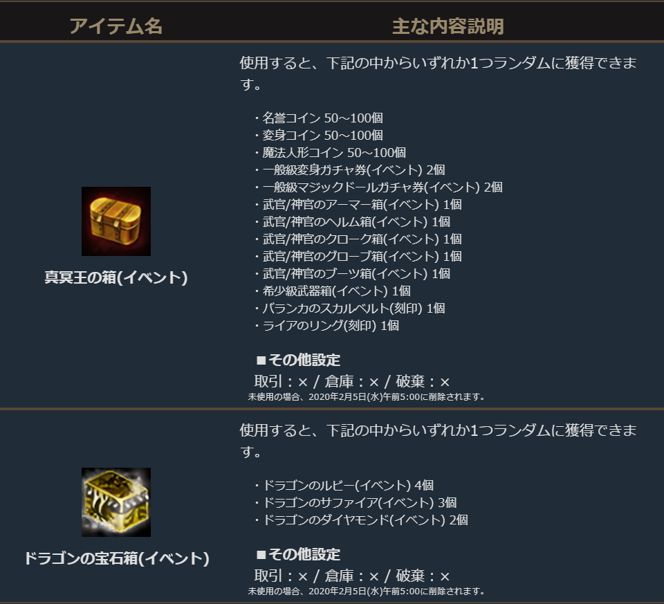 ※各種コインと「ライアのリング(刻印)」、「バランカのスカルベルト(刻印)」を除き、未使用の場合は2020年2月5日(水)午前5:00に削除されます。