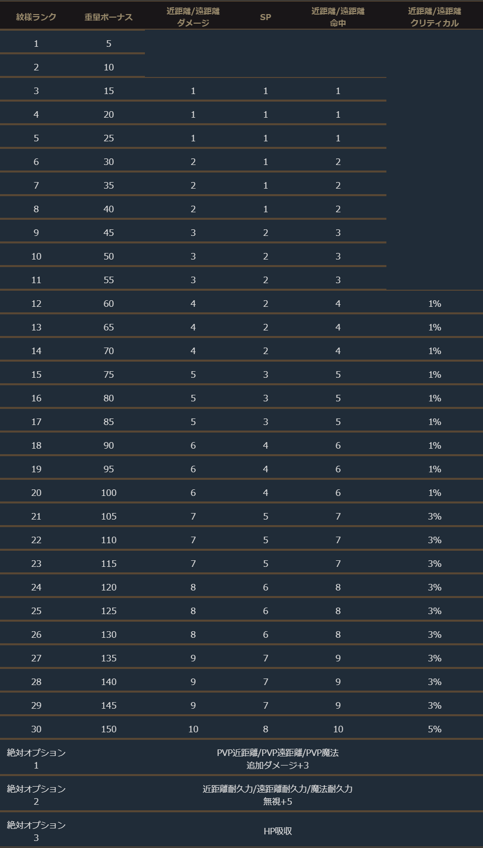 紋様ランクが1段階ごとに重量ボーナス5が上昇し、3段階から追加ダメージ/命中/SPが上昇、12段階以降にクリティカルのステータスが上昇します。