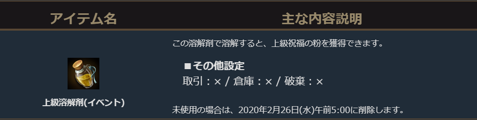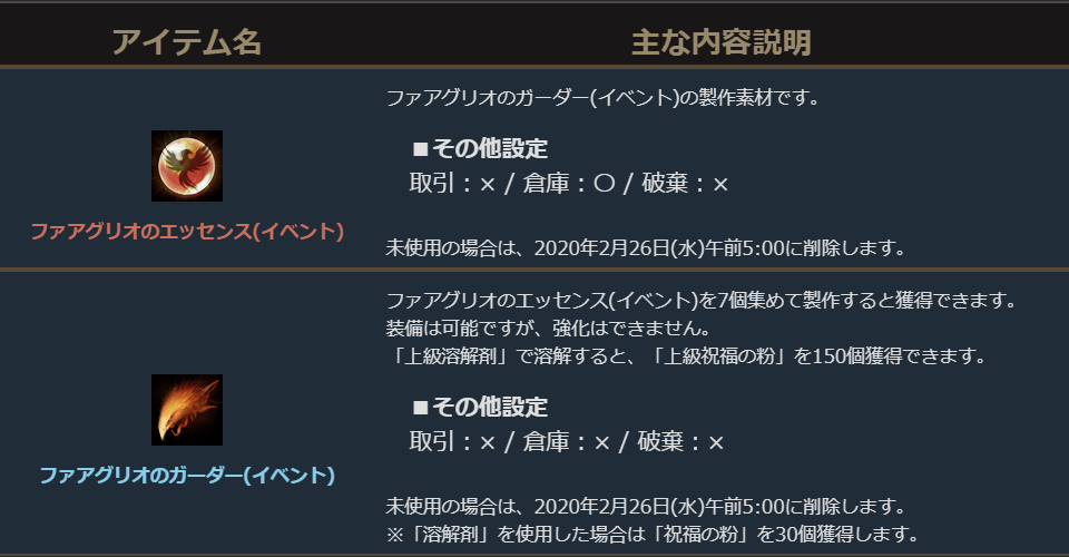 イベント期間中は、メニュー > 製作 > 限定 > 溶解剤より、1アカウントにつき1回まで「ファアグリオのエッセンス(イベント)」7個を材料に「上級溶解剤(イベント)」を製作できます。