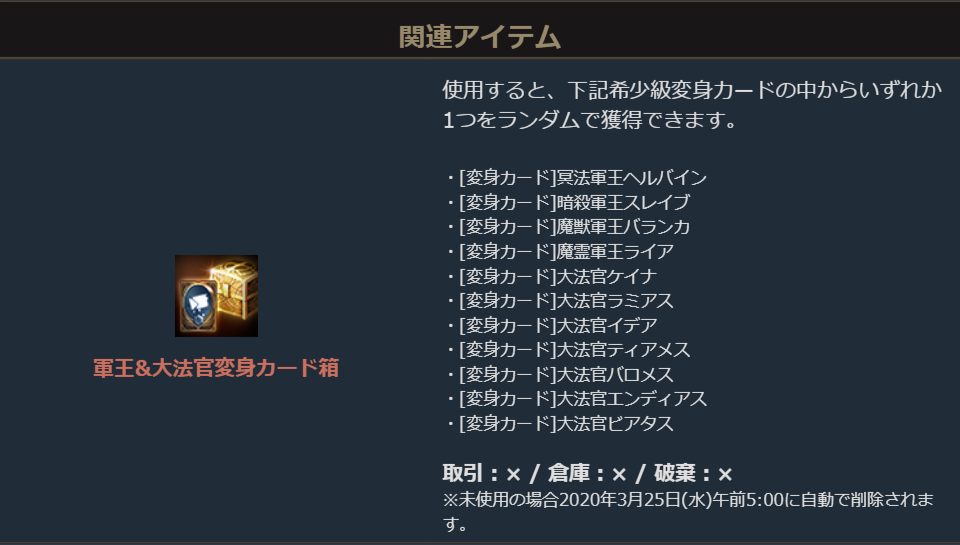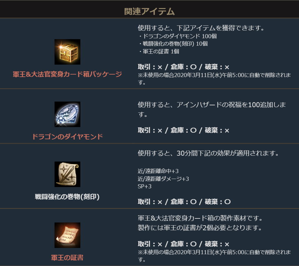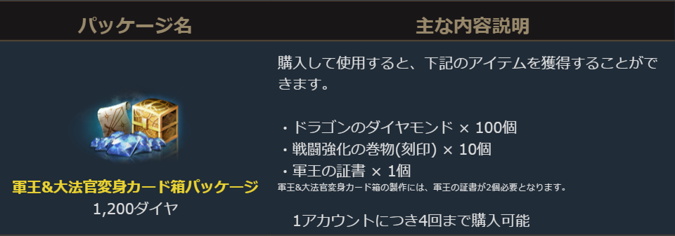 軍王や大法官の希少級変身カードが獲得できる材料アイテムとドラゴンのダイヤモンドがセットになったお得な「軍王&大法官変身カード箱パッケージ」についてお知らせいたします。