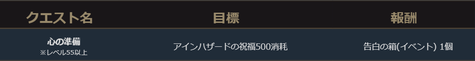 イベント期間中レベル55以上のキャラクターに下記クエストが配信されます。