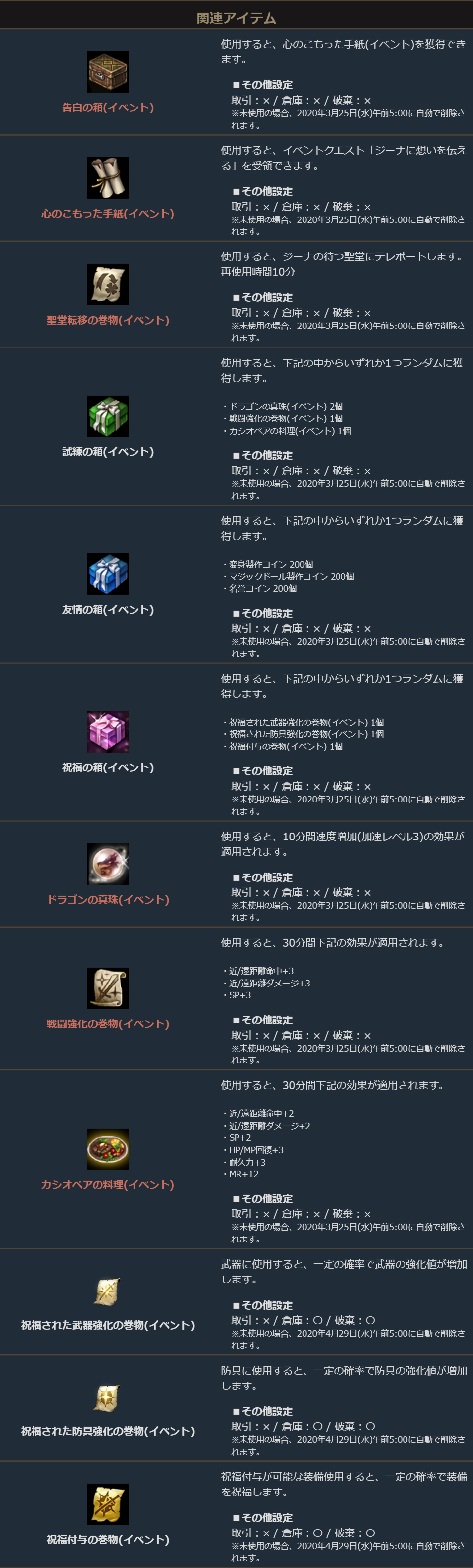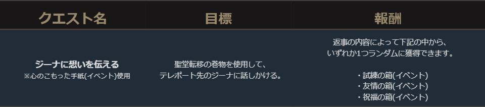 クエスト報酬の「告白の箱(イベント)」を使用すると、ジーナへ想いを伝えるための「心のこもった手紙(イベント)」を獲得できます。