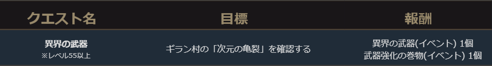 ギラン村に出現した次元の亀裂を調査して「異界の武器(イベント)」を手に入れましょう!