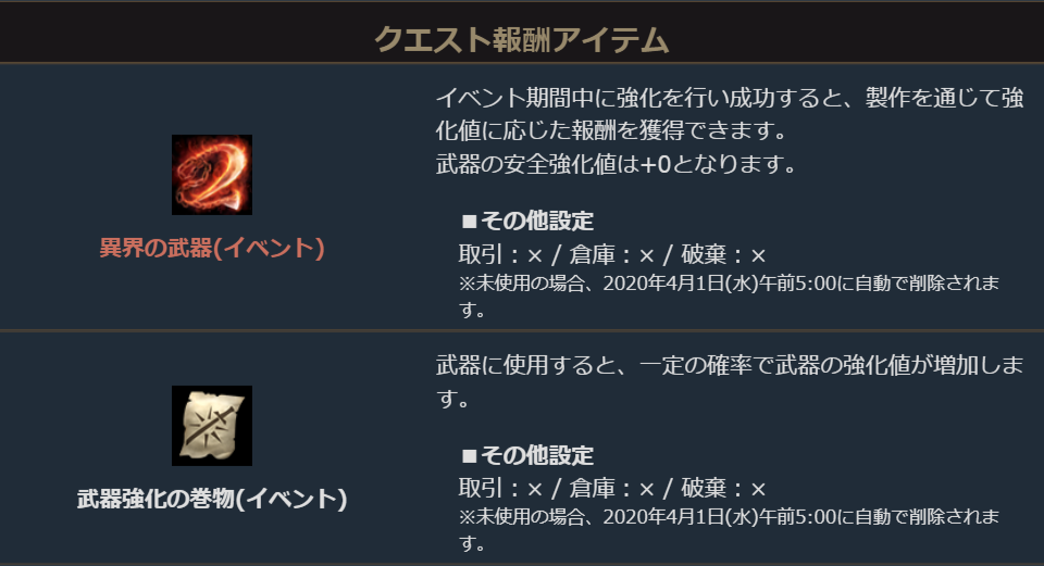 クエスト報酬の「異界の武器(イベント)」を強化すると、製作を通じて強化値に応じた報酬を獲得できます。
