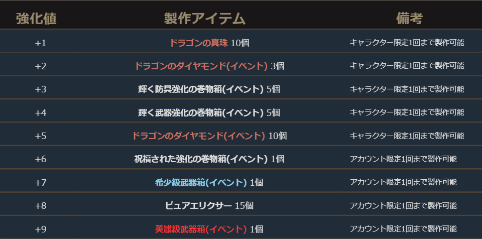 ※アカウント限定1回のアイテムを製作すると、アカウント内における同一サーバーのキャラクターで製作できなくなります。