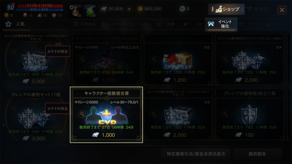 ・「キャラクター経験値合算」アイテムの購入条件は、職業が「竜闘士」のLv30~79のキャラクターです。