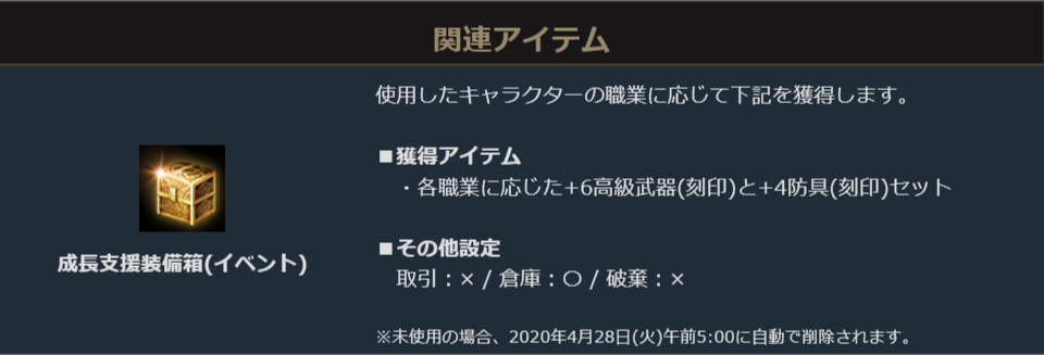 ※「成長支援装備箱(イベント)」から獲得できるアイテムは2020年5月7日(木)午前5:00に自動で削除されます。