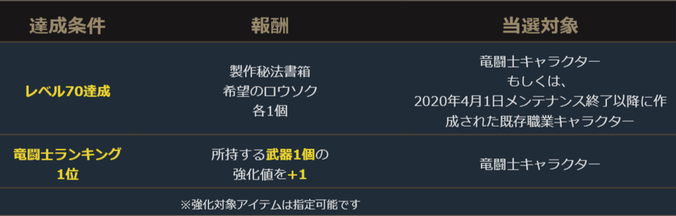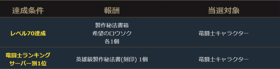 ※ケレニス01サーバーの竜闘士ランキング1位の当選キャラクターへは、イベント終了後に準備が整い次第、当選と報酬の手続きについて郵便にてご連絡させていただきます。