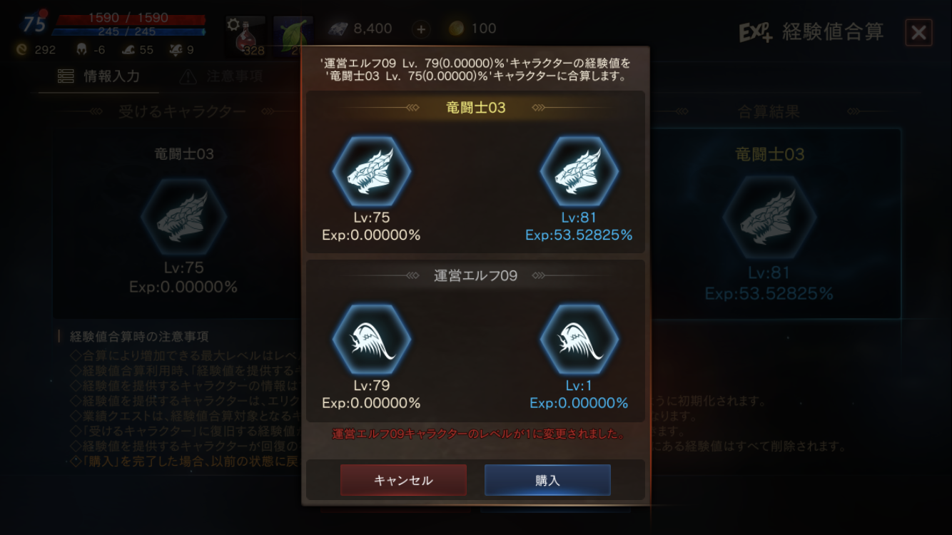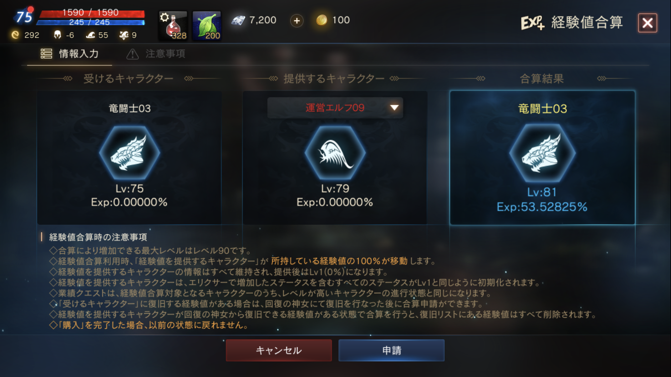 キャラクターが保有する経験値を、同じサーバー内の職業から竜闘士の別キャラクターへ合算!