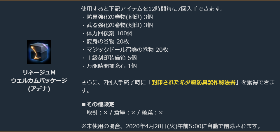 リネージュMウェルカムパッケージ(アデナ/ダイヤ)に関しまして「倉庫:〇」とご案内しており、ゲーム内表記も準拠いたしておりましたが正しくは倉庫に預け入れできないアイテムとなります。下記ご案内の表記をこの度修正させていただきましたが、ゲーム内アイテムに関しましては動作上倉庫預け入れができないものとなっておりましたためこのまま進行させていただきます。誤ったご案内を行いましたこと深くお詫び申し上げます。