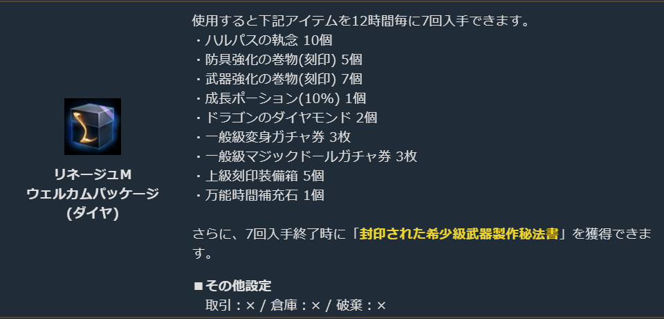 「リネージュMウェルカムパッケージ(ダイヤ)」