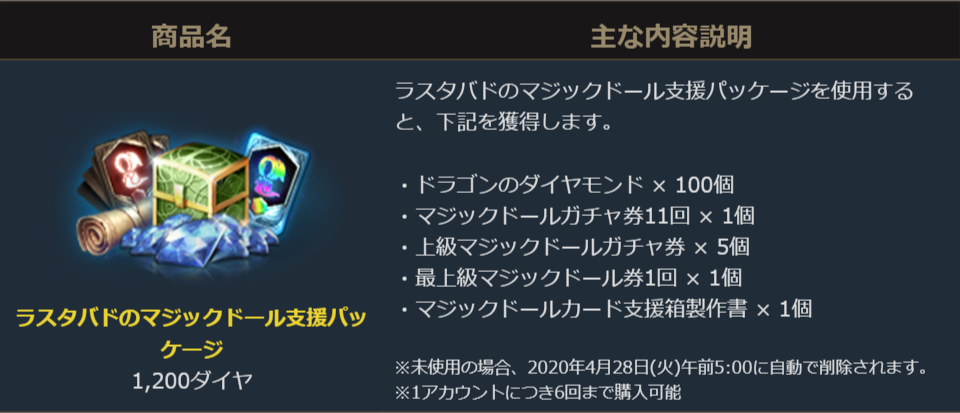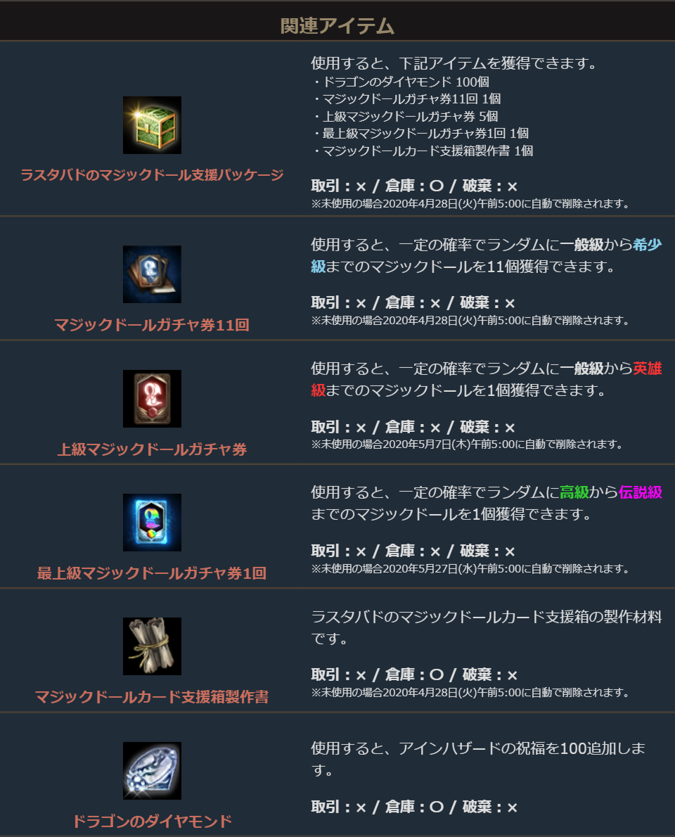 ・ラスタバドのマジックドールカード支援箱(英雄)の製作に成功(大成功含む)した場合、パンドラの製作の証3個が郵便で送られます。