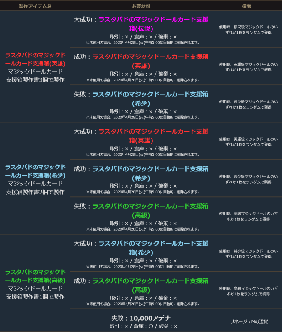 ・ラスタバドのマジックドールカード支援箱(希少)の製作に成功(大成功含む)した場合、パンドラの製作の証2個が郵便で送られます。