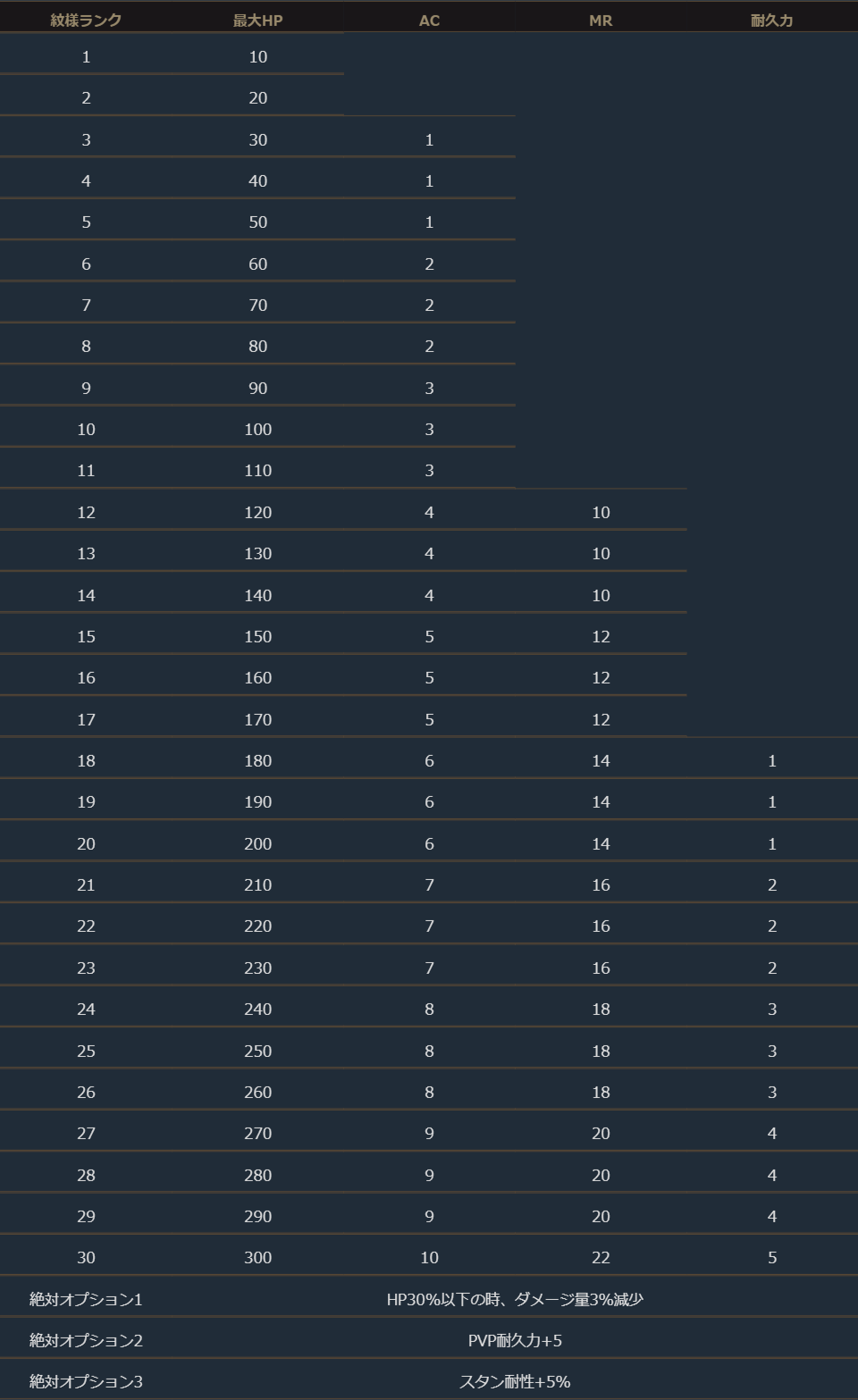 紋様ランクが1段階ごとにHPが10上昇し、3段階からACが上昇、12段階以降にMRが上昇、18段階から耐久力のステータスが上昇します。