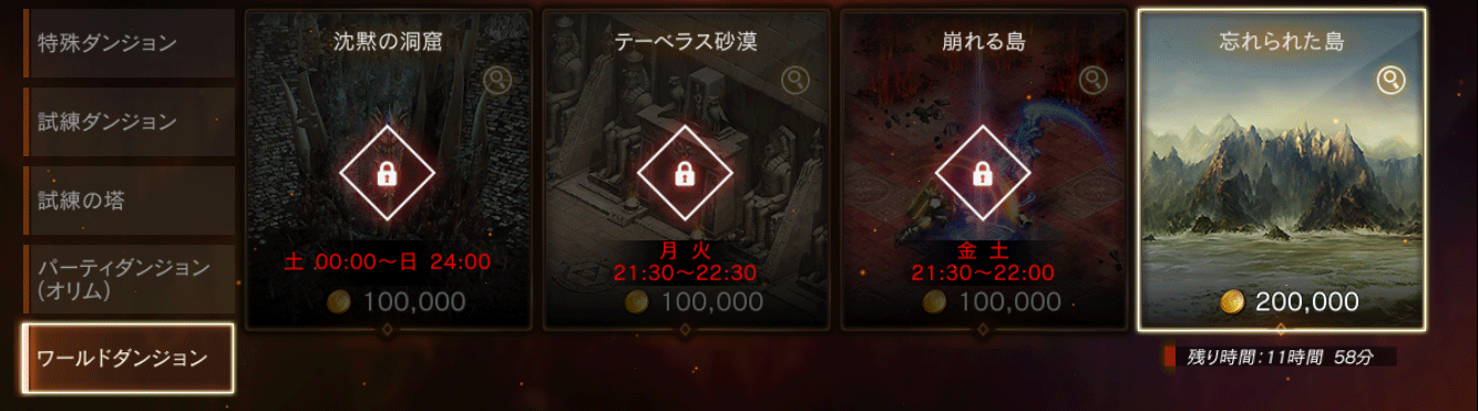入場はメニュー > ダンジョン > ワールドダンジョンから、「忘れられた島」を選択してください。