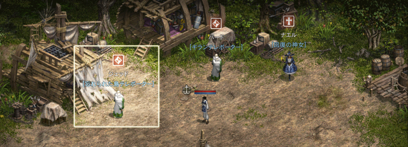 「忘れられた島」へ移動すると雑貨商人や魔法の巻物商人、アデン商団、総合倉庫番と、忘れられた島の「東西南北へ移動」することができる「テレポーター」がいます。