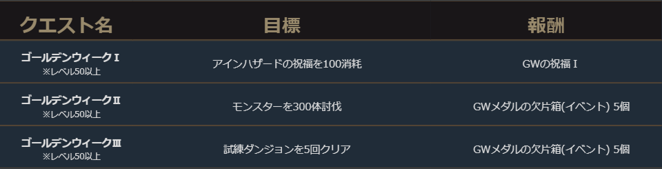 イベント期間中、レベル50以上のキャラクターへ3つのデイリークエストが付与されます。