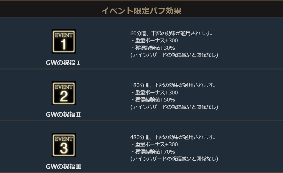 そして、「GWの祝福Ⅱ」バフの有効時間が終わるとと、「GWの祝福Ⅲ」バフと変化します。
